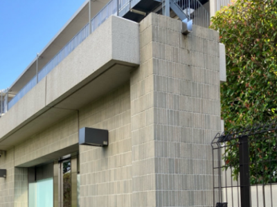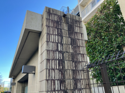 マンションの入り口の門構えですが、雨や汚れ、菌類の繁殖などで悲しい姿に。